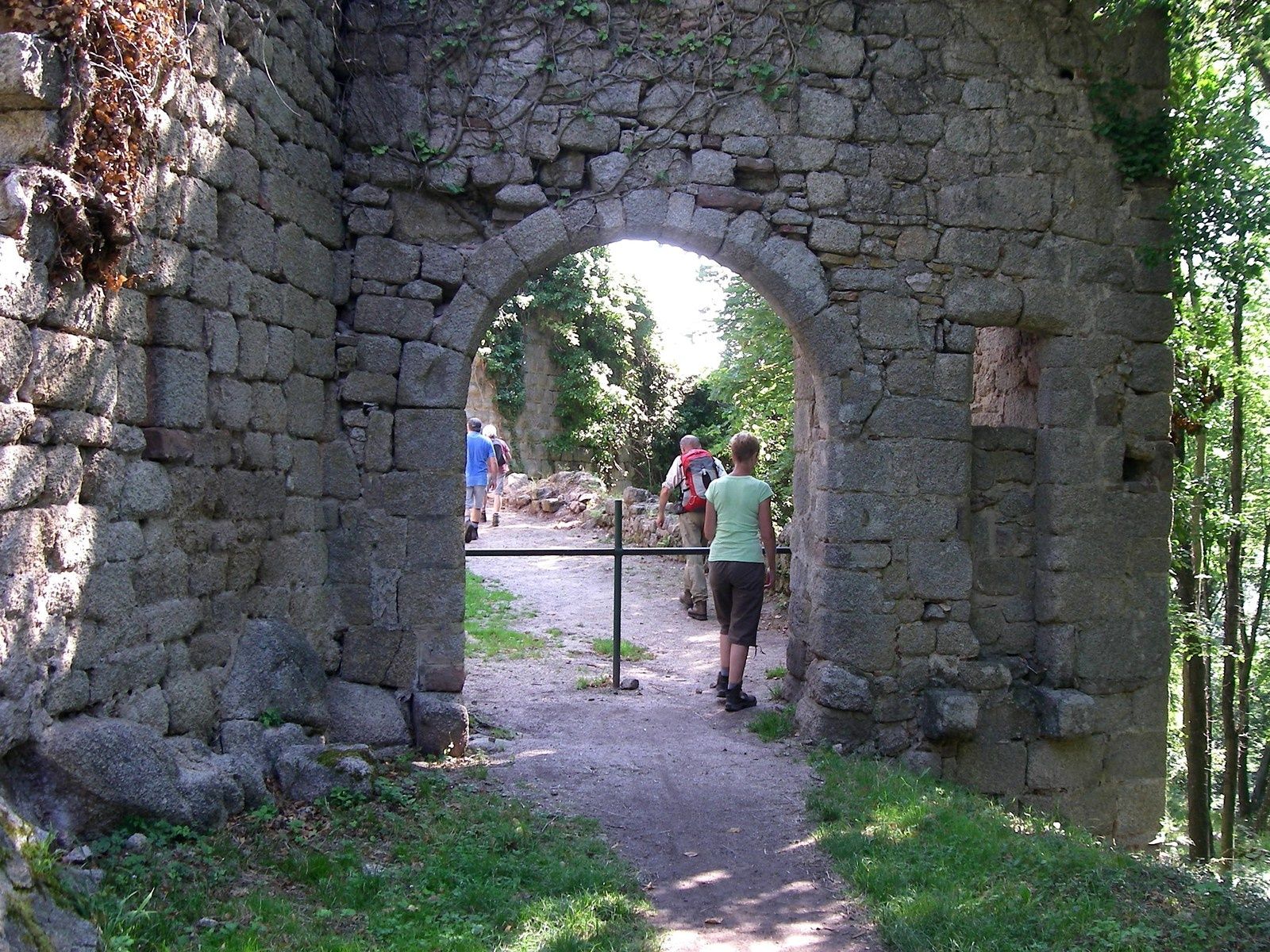 Après un quart d’heure d’une montée assez facile, on ne résiste pas à l’envie de grimper encore : d’abord dans la basse-cour, où apparaissent les restes éboulés de la maison de campagne édifiée là, vers 1830, par un ancien propriétaire, Félix de Dartein ; puis dans l’enceinte du « palas », le logis seigneurial ; enfin, et surtout, dans la brèche aménagée dans la base du donjon par de précédents chercheurs de trésors.